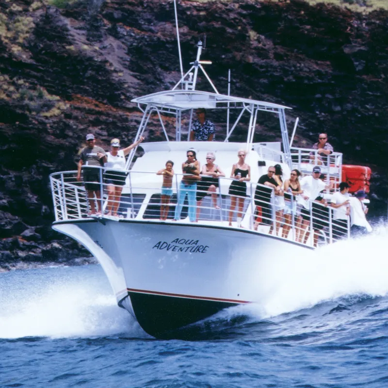 The Aqua Adventure is a 2003 model, twin-engine, high-speed vessel. She is powered by two 350 horse Cummins diesels that push her along at 22 knots. There is an upper sun deck, lower shaded deck as well as a walk-around-cabin that gives you access to the bow.